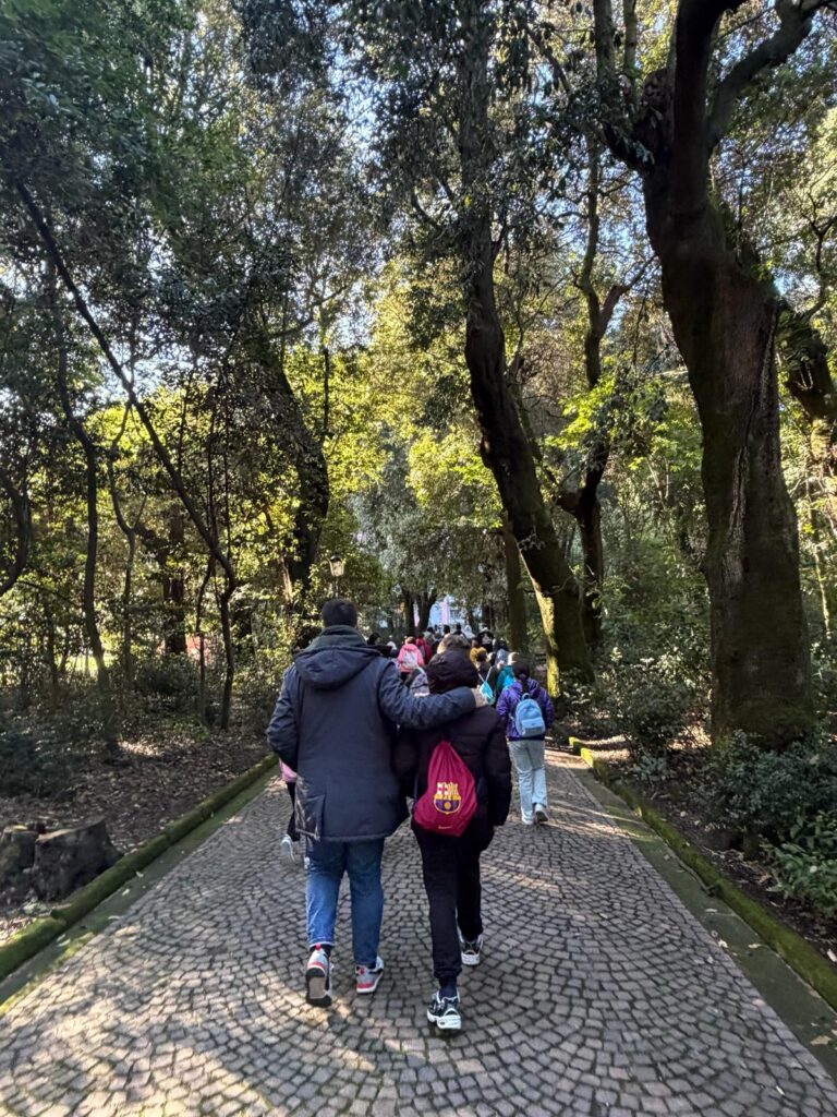 Terminata l’esperienza all’interno della Reggia, la giornata si è spostata nella maestosità del Real Bosco di Capodimonte, il parco che si estende prospiciente il palazzo. Con i suoi 134 ettari, il Bosco non è solo il più grande parco urbano di Napoli e un vitale polmone verde, ma un vero e proprio capolavoro di architettura paesaggistica e un museo diffuso. I ragazzi hanno potuto godere appieno di questo spazio storico, organizzando attività all’aria aperta e approfittando della serenità e della bellezza dei viali e delle praterie.